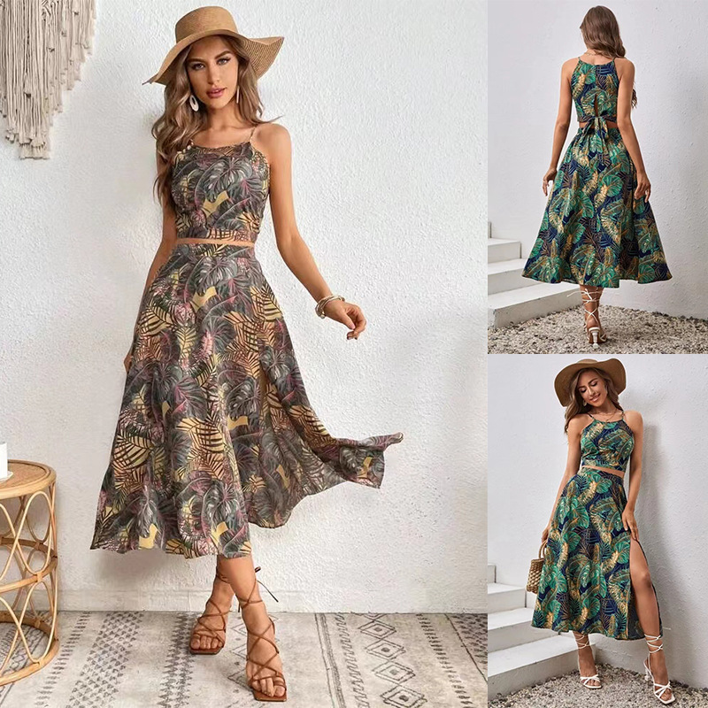 2Pcs Printed Suit Summer Sexy V-neck Halter Top And Pleated Short Skirt Women's Dress Set Clothing